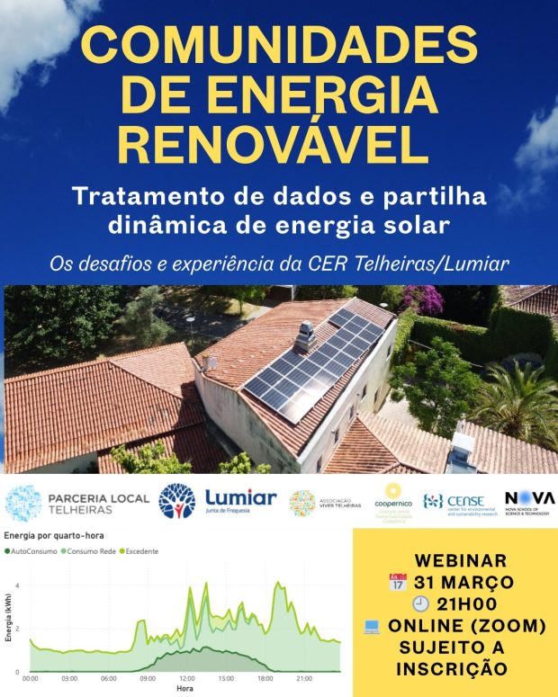 No dia 31 de Março, terça-feira, entre as 21h00 e as 22h00, a Comunidade de Energia Renovável (CER) de Telheiras/Lumiar vai dinamizar o Webinar online “Comunidades de Energia Renovável: Tratamento de dados e partilha dinâmica de energia solar”. Este webinar conta com a participação da E-Redes, enquanto operador da rede de distribuição de eletricidade e interveniente crucial na gestão do autoconsumo coletivo e das comunidades de energia.
